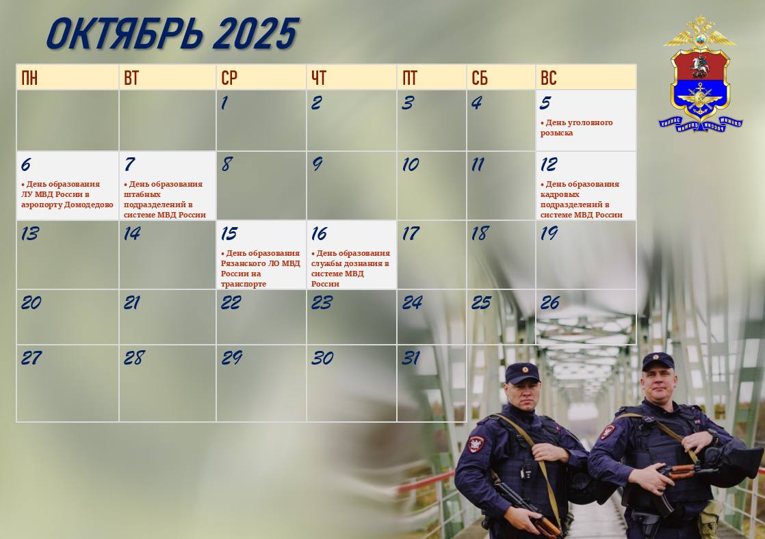Публикуем календарь памятных дат на этот месяц от УТ МВД России по ЦФО. Сохраняйте, чтобы не пропустить ключевые события и профессиональные праздники.
