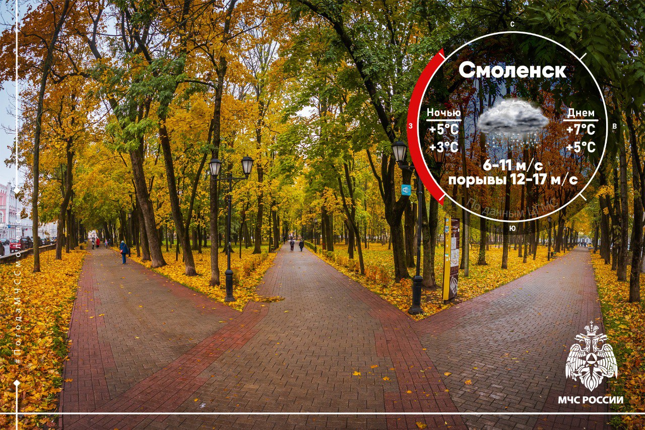 Температура воздуха по области ночью опустится до 0°C…+5°C, днём +3°C …+8°C. В Смоленске ночью ожидается +3°C…+5 °C, днём +5°C…+7 °C.
