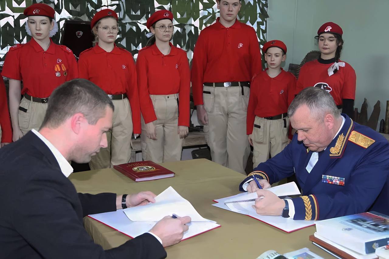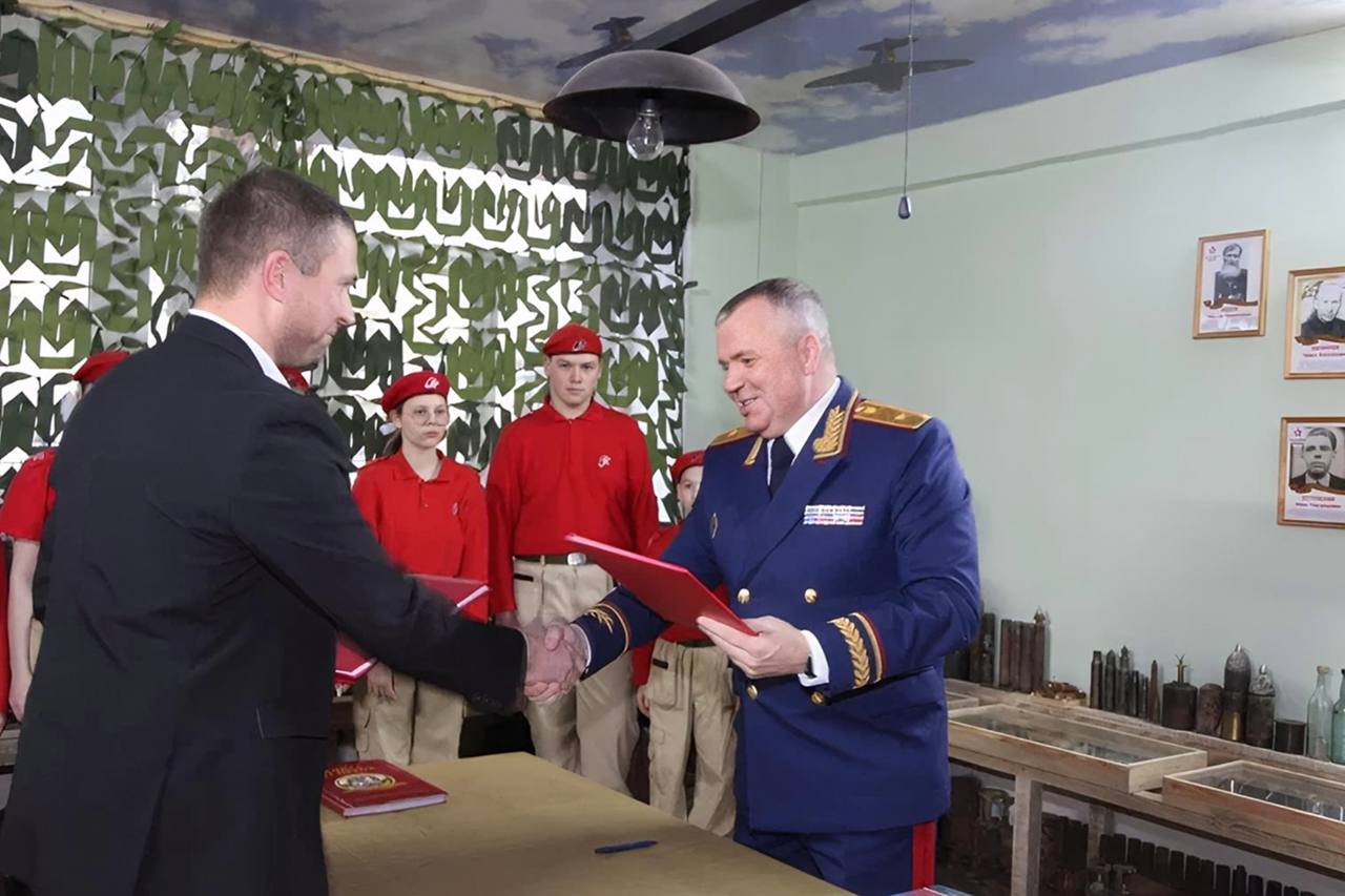 В целях укрепления взаимодействия с молодёжными общественными организациями и развития патриотического воспитания граждан руководитель следственного управления Следственного комитета Российской Федерации по Смоленской области Анатолий Юрьевич Уханов заключил соглашение о сотрудничестве с начальником штаба регионального отделения Всероссийского детско-юношеского военно-патриотического общественного движения «ЮНАРМИЯ» Никитой Александровичем Меченовым.