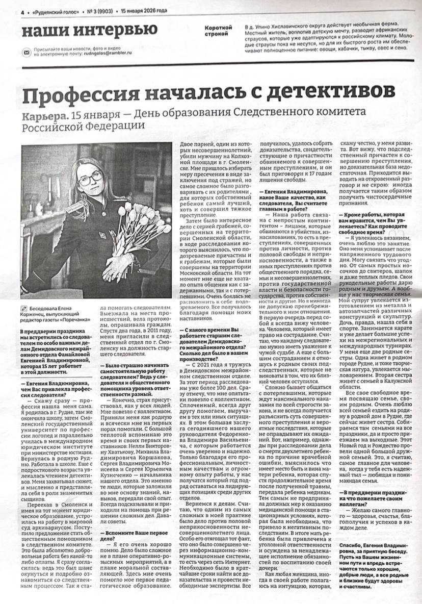 Более подробно ознакомиться с интервью следователя можно на страницах издания «Руднянский голос» выпуск № 3 (9903) от 15.01.2026 года.