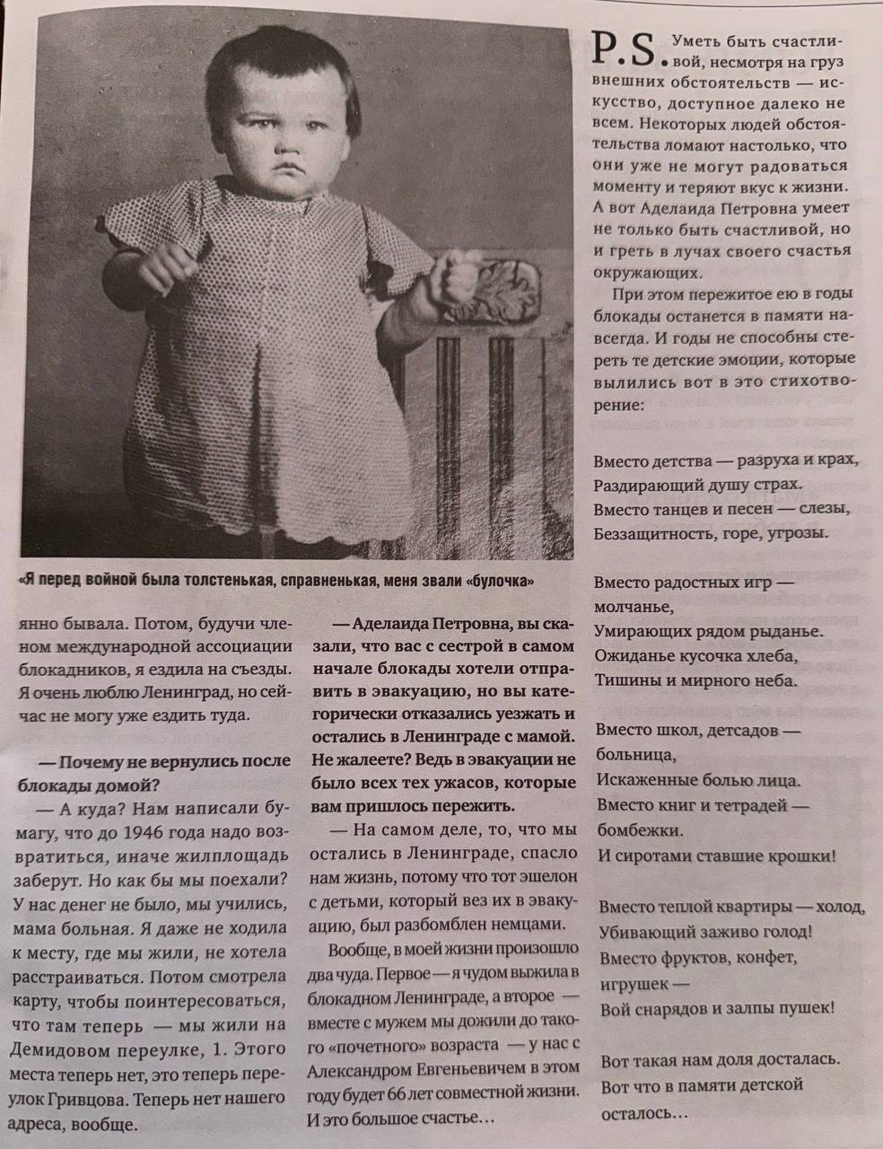 На момент начала блокады Аделаиде Петровне было всего пять лет. Несмотря на пережитые тяготы, она считает своим искусством не только быть счастливой, но и делиться этим счастьем с окружающими, согревая их своим внутренним светом. Её история — это мощный посыл о ценности жизни, любви и человеческой стойкости.