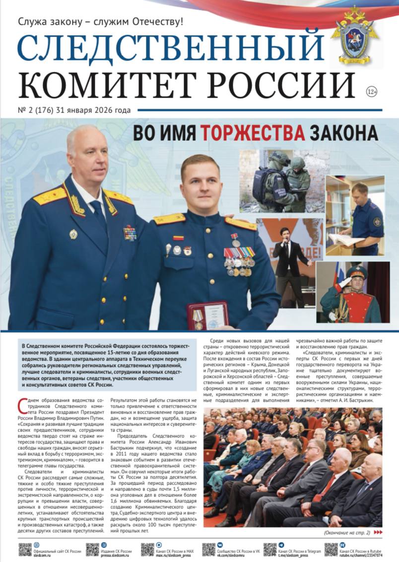 На официальном сайте СУ СК России по Смоленской области в разделе «Издания Следственного комитета России» размещен очередной выпуск газеты «Следственный комитет России» от 31.01.2026 № 2 (176).