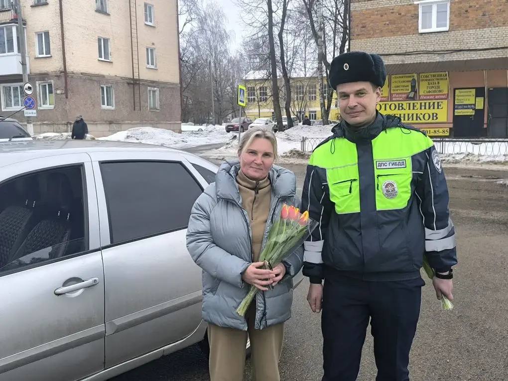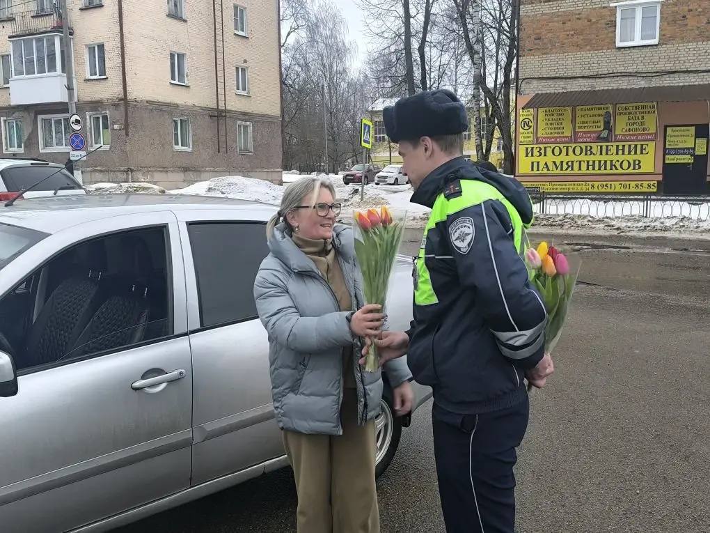 Во время поздравительной акции инспекторы ДПС останавливали автомобили под управлением прекрасной половины человечества, которых ждал приятный сюрприз.