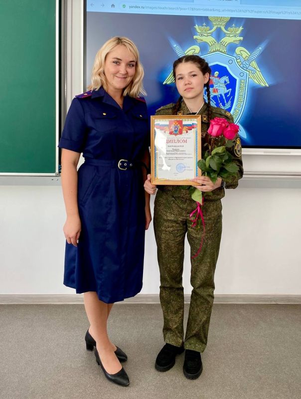 Диплом Председателя СК России А.И. Бастрыкина за активное участие в ведомственном образовательном проекте «Патриоты Отечества» вручен 17-летней Анастасии Черновой.В рамках проекта ученица кадетского класса представила исследовательскую работу «Герои...