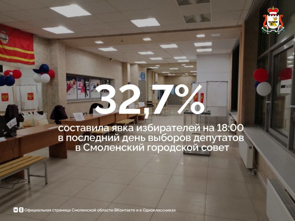 Выборы депутатов Смоленского городского Совета, которые длились три дня, официально завершились. В Смоленске уже закрылись все избирательные участки. По данным на 18:00, явка избирателей в последний день голосования составила 32,7% от общего числа...