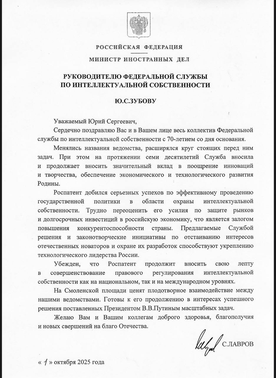 Министр иностранных дел России С.В.Лавров поздравил руководителя Федеральной службы по интеллектуальной собственности Ю.С.Зубова: