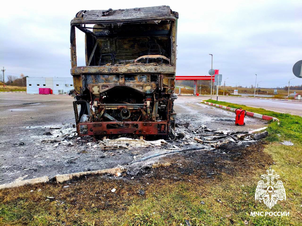 На стоянке автодороги М-1 в Смоленском муниципальном округе горел тягач с полуприцепом. Выгорела кабина, поврежден прицеп. Груз спасен. Водитель, к счастью, не пострадал.