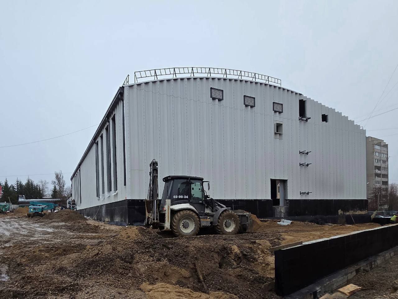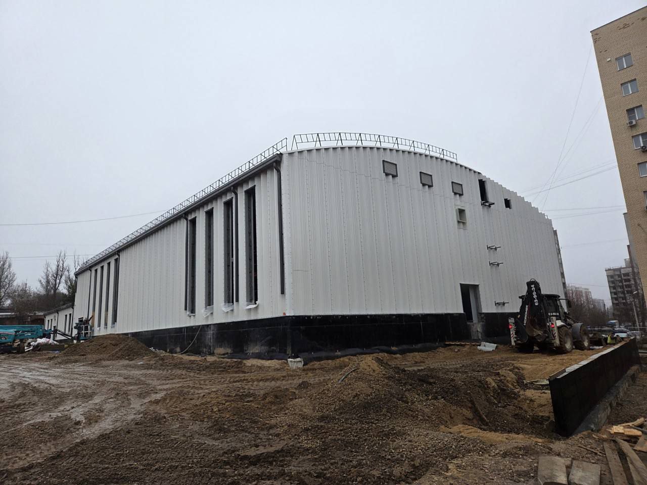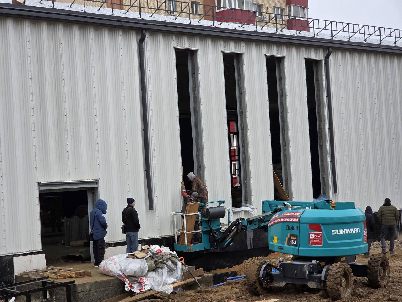 На площадке уже выполнены основные конструктивные работы: обустроена фундаментная плита, практически завершён монтаж металлического каркаса здания, возведены две монолитные подпорные стены. Также к объекту подведены инженерные сети водоснабжения и канализации.