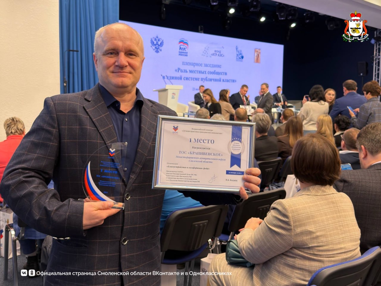 Церемония прошла в рамках Форума местного и общественного самоуправления «Роль местных сообществ в единой системе публичной власти» в Москве, где Смоленскую область представляла делегация во главе с министром по внутренней политике Петром Мухиным.