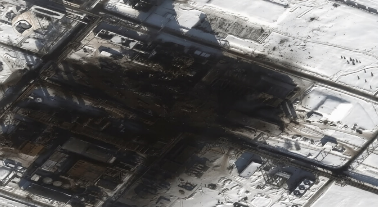 Последствия ударов дронов-камикадзе ВСУ по химическому заводу «Дорогобуж» в Смоленской области, снятые со спутника.