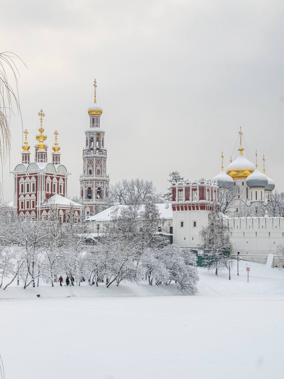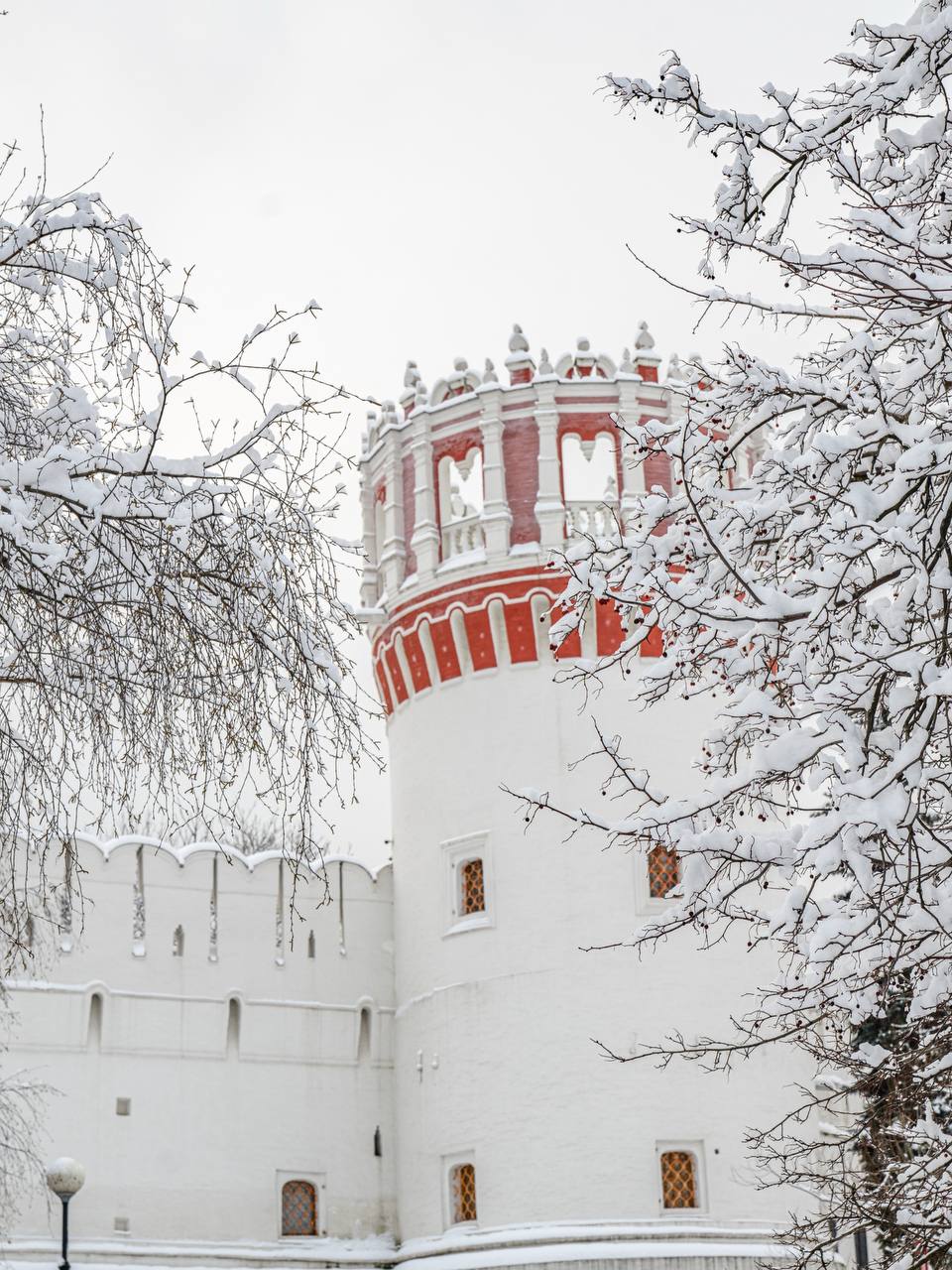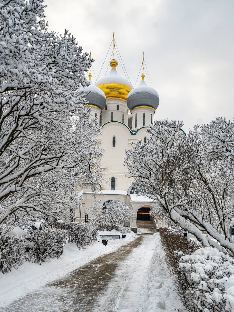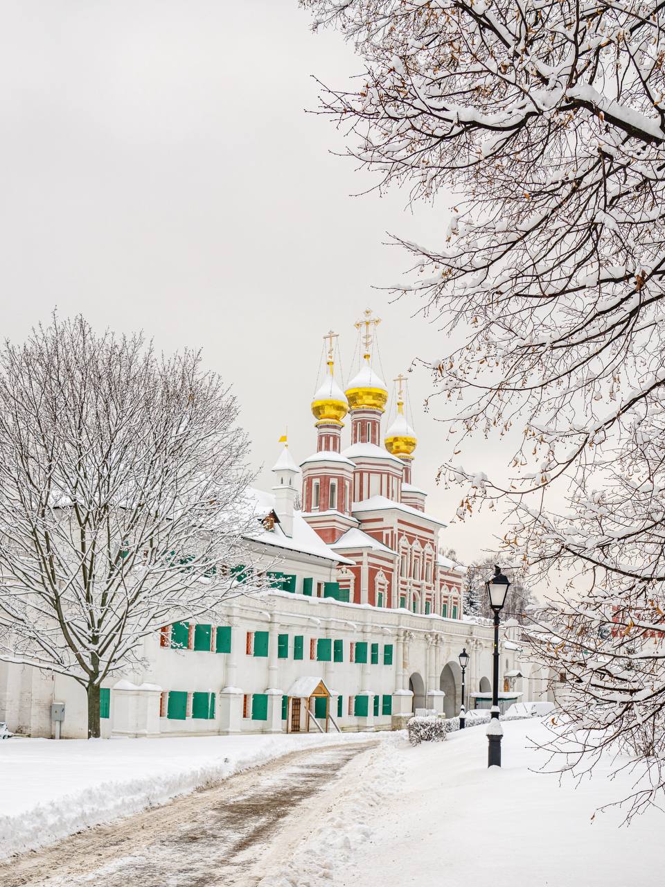 Смоленский собор на фото 2 - единственный из всего ансамбля, который сохранился с 16 века, остальные постройки - это уже конец 17 века. Масштабное строительство монастыря начала царевна Софья. При ней в модном нарышкинском стиле были перестроены башни и стены монастыря, а также построены основные монастырские храмы и колокольня. В закомарах надвратной церкви (фото 8) Преображения мы видим раковины, как в Архангельском соборе московского Кремля, башни монастыря украшены декоративными коронами с гребешками, а окна на храмах, трапезной и палатах оформлены наличниками с разорванными фронтонами. Колокольня своей ярусностью напоминает колокольню Ивана Великого.