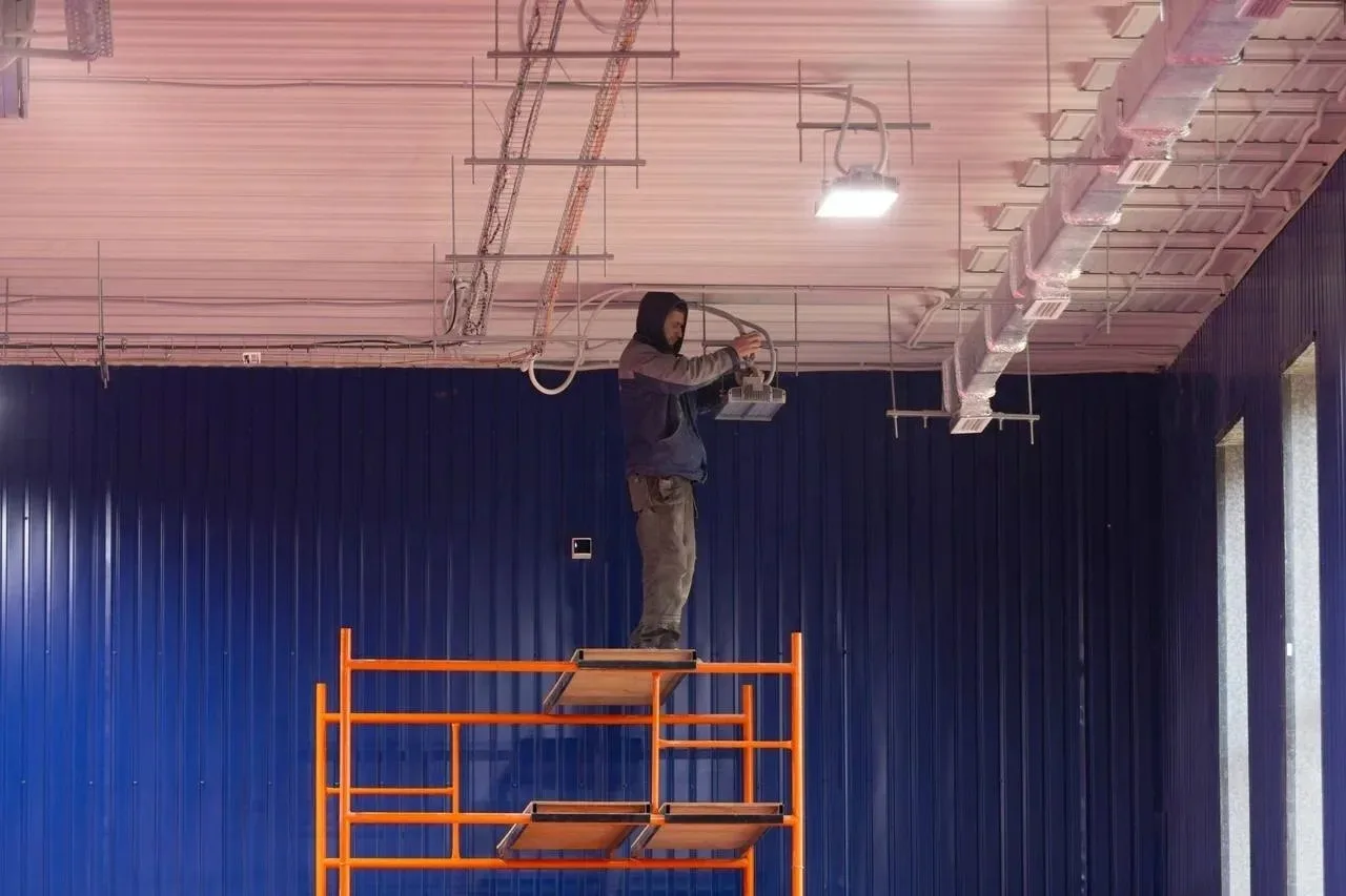 Здесь разместятся профессиональный игровой зал на 12 теннисных столов, раздевалки, санузлы и все необходимые вспомогательные помещения. Особое внимание уделяется благоустройству прилегающей территории, включая организацию пешеходных дорожек. К ней подрядчик уже приступил, параллельно с завершением внутренних работ, и сейчас готовит основание под будущее покрытие.