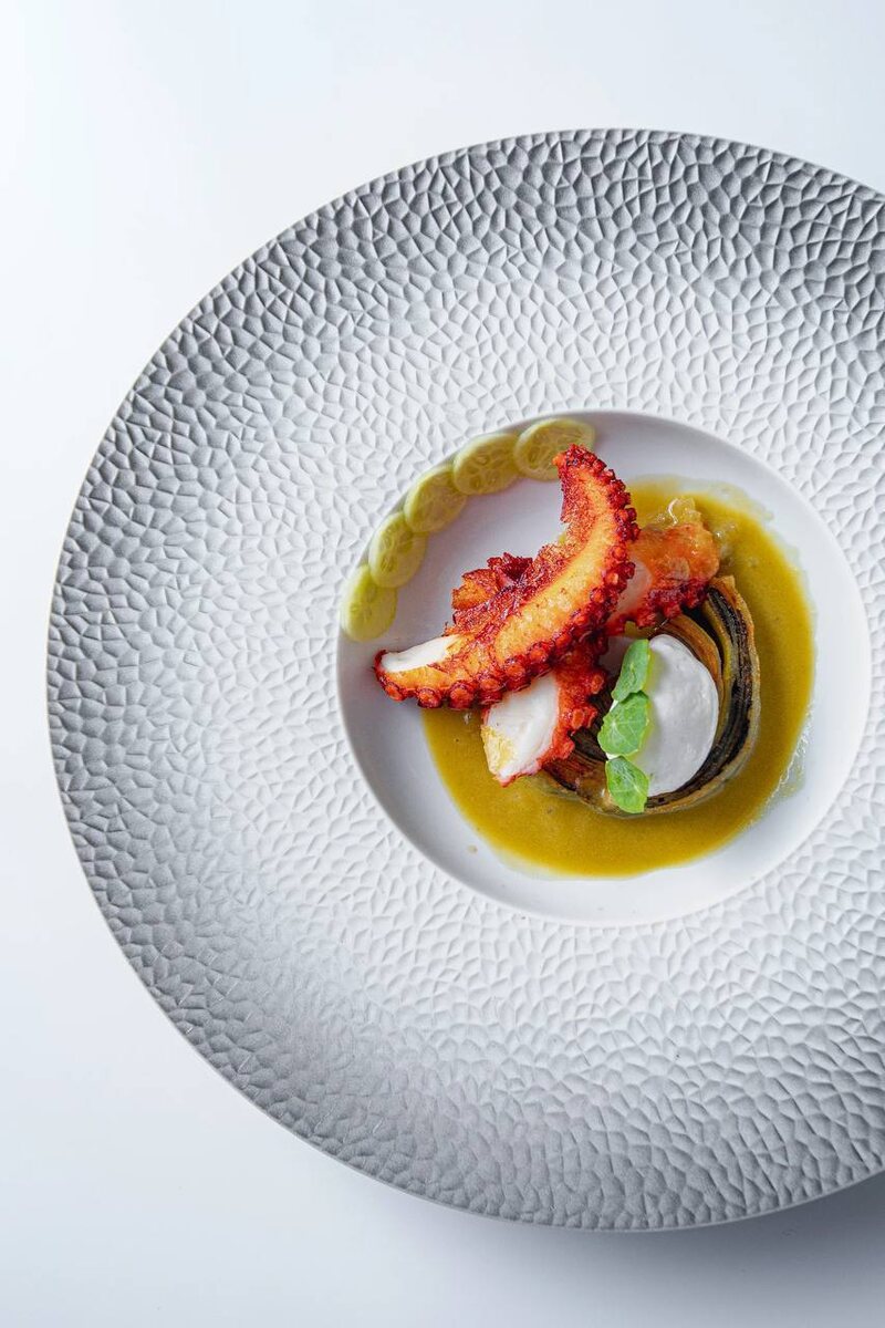 Основным персонажем этого кулинарного спектакля является осьминог, задуманный как центральный элемент блюда. Для его приготовления шеф-повар использует метод давления, который позволяет сохранить всю сочность и текстуру мяса. После этого осьминог обжаривается во фритюре всего на 15 секунд, что обеспечивает ему хрустящую корочку, идеально дополненную кремовыми соусами.