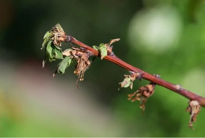 - Первый этап: Сначала начинают засыхать цветы, а затем и листья. Этот процесс часто воспринимается как следствие заморозков. На стволах можно заметить трещины и выделение смолы, а пораженные ветви со временем будут увядать.