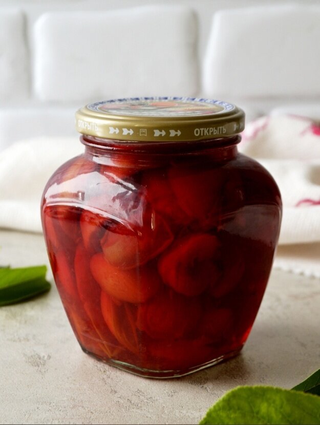 Залейте горячий сироп обратно в банку, дойдя до самого верха, и закройте крышкой. Переверните банку вверх дном и проверьте герметичность. Укутайте в теплое полотенце на сутки, чтобы всё это время компот «настаивался».