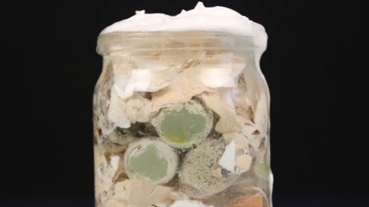 - Замачивание: На 100 грамм скорлупы добавьте 300 миллилитров 9% уксуса. Используйте стеклянную банку, чтобы реакция проходила активно.