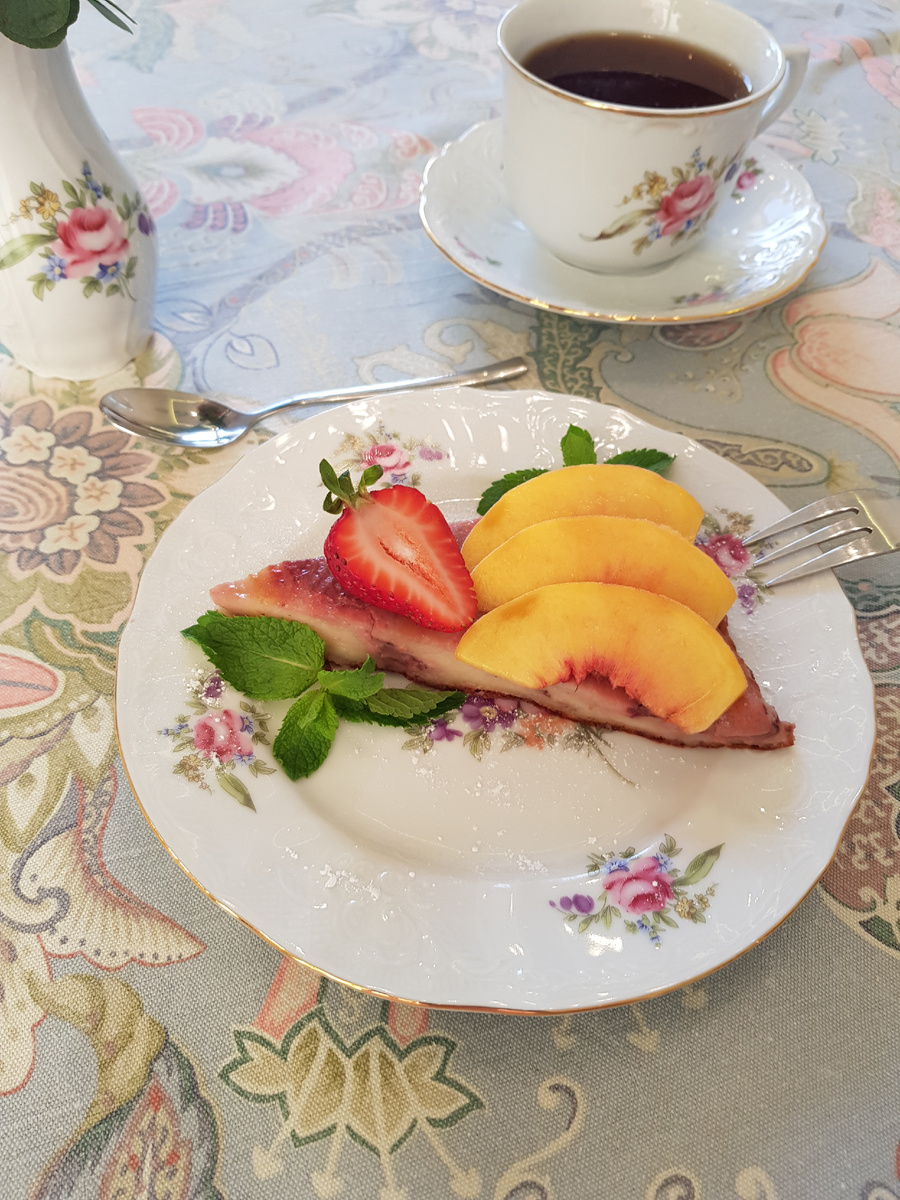 По завершении, разрезать запеканку на порции и подавать, украсив свежими ягодами клубники, персиками и веточкой мяты. Приятного аппетита!