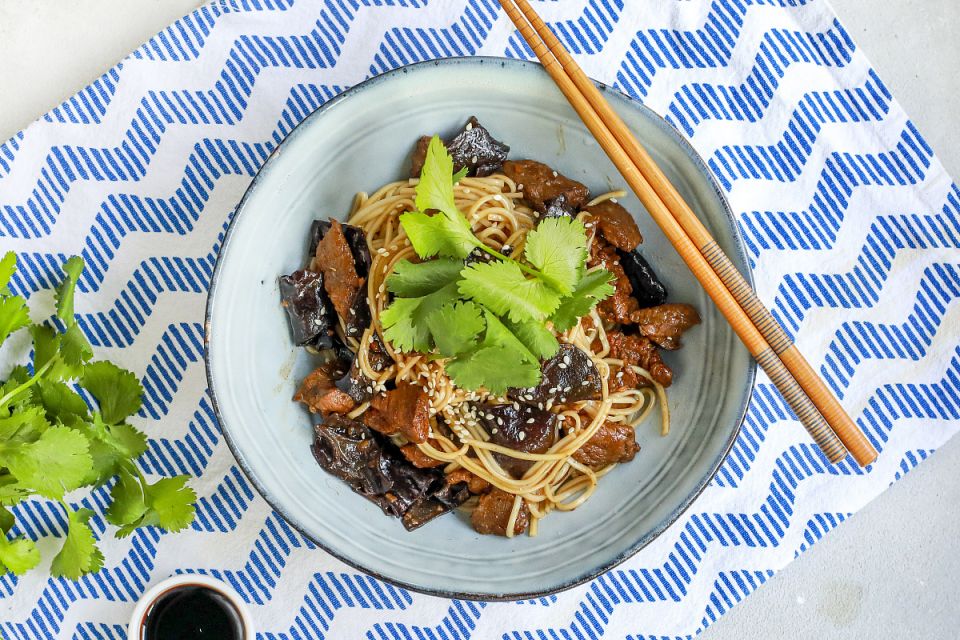 На сервировочной тарелке уложить лапшу, сверху выложить говядину, украсить кинзой и посыпать кунжутом. Блюдо готово для подачи — наслаждайтесь!