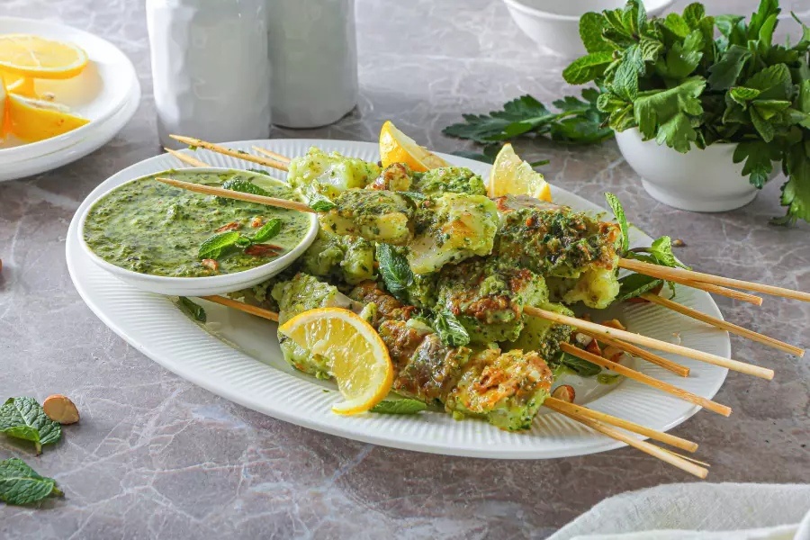 Готовый шашлык — это не просто угощение, а настоящий кулинарный шедевр, который идеально подойдет для романтического ужина или семейного торжества. Подается с оставшимся песто и свежими овощами, а нежный вкус рыбы дополняется яркими ароматами пряной зелени и лимона.