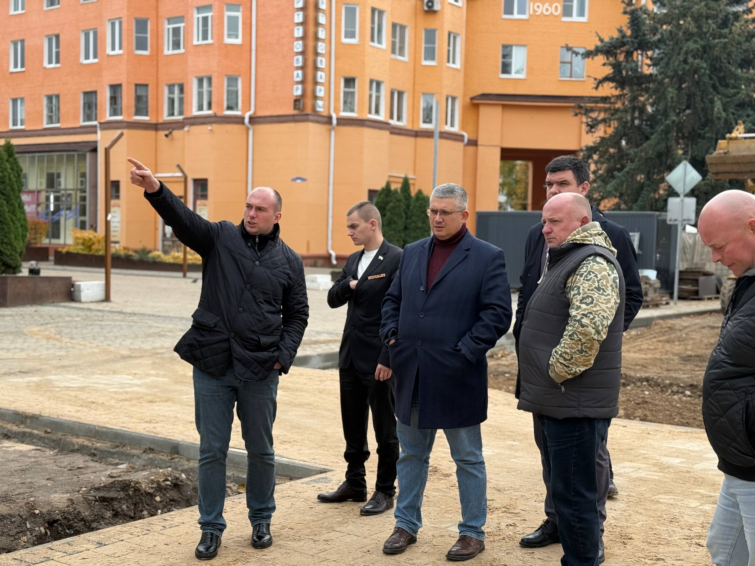 Следующей точкой нашего объезда стала улица Докучаева. На первом участке в полном объеме уложена брусчатка, сейчас работы ведутся на второй половине будущего сквера: выполнено устройство основания, на днях приступили к укладке покрытия.