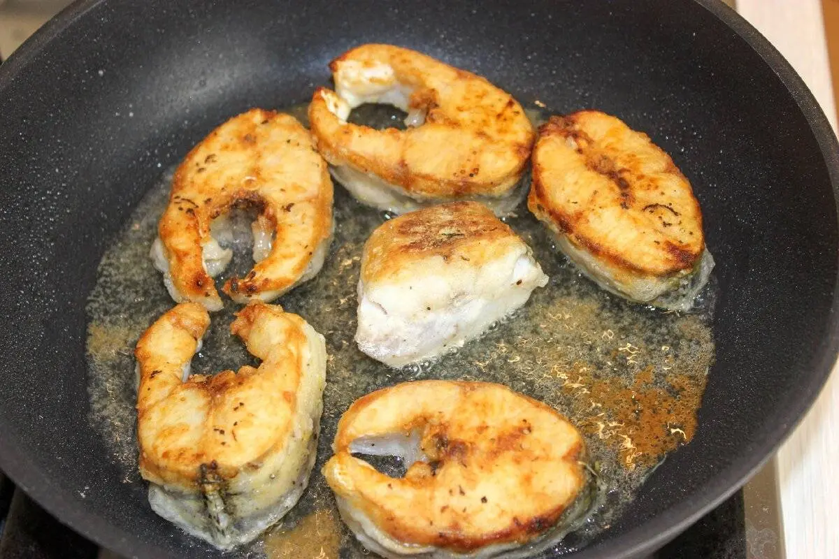 - Разогрейте растительное масло до высокой температуры. Обратите внимание на том, что недостаточно горячее масло приводит к тому, что рыба начинает тушиться, а не жариться, что мешает образованию аппетитной корочки.