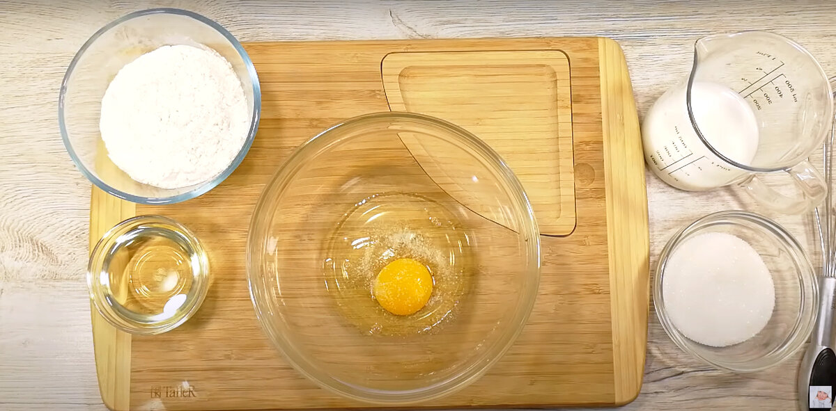 Для начала в глубокой миске разбивается одно яйцо, добавляется щепотка соли и 80 граммов сахара. Все ингредиенты тщательно перемешивают венчиком. Затем следует ввести чайную ложку ванильного сахара для аромата и добавить 150 мл молока, а также 60 граммов растительного масла. Если задачи требуют, растительное масло можно заменить растопленным сливочным.