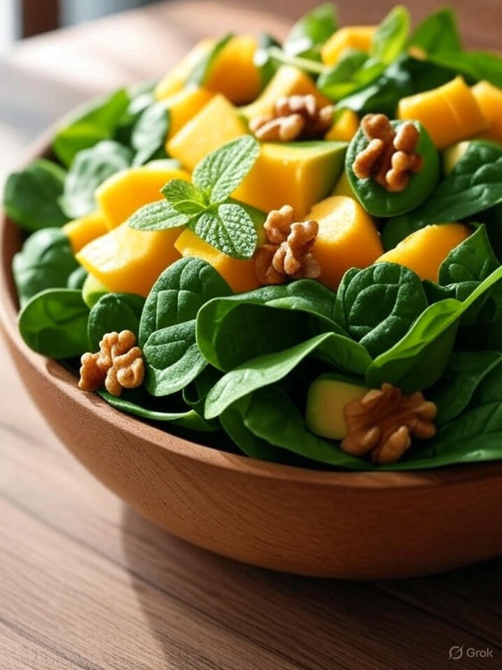 Манго обеспечивает организм витаминами A и C, которые полезны для здоровья кожи и поддерживают иммунную систему. Шпинат добавляет в блюдо железо и другие минералы, а авокадо обогащает салат здоровыми жирами. Добавление орехов не только повышает питательную ценность, но и придаёт блюду насыщенный вкус и текстуру. Такой салат — идеальный выбор для легкого ужина или как дополнение к основному блюду.