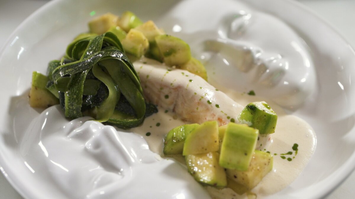 Финальный аккорд кулинарного шедевра! Лосось аккуратно выкладывается на тарелку, поливается сверху ароматным соусом, а рядом располагаются яркие цукини. Для завершения композиции добавьте немного зеленого масла и маринованных очисток от цукини — не только вкусно, но и визуально привлекательно!