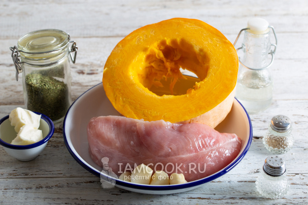 Не забудьте о чесноке: положите целые зубчики на мясо, а также дополнительные кусочки сливочного масла, чтобы добавить сочности и великолепного аромата. Запекайте блюдо в разогретой духовке около 30 минут. За это время индейка дойдет до готовности, а тыква приобретет мягкость и аромат.