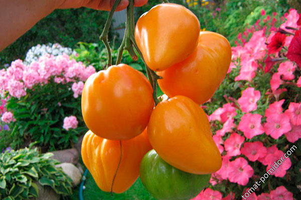 - Плоды имеют ярко-оранжевый цвет и сердцевидную форму. Веса могут варьироваться от 300 до 400 граммов, а первые экземпляры достигают 500 граммов.