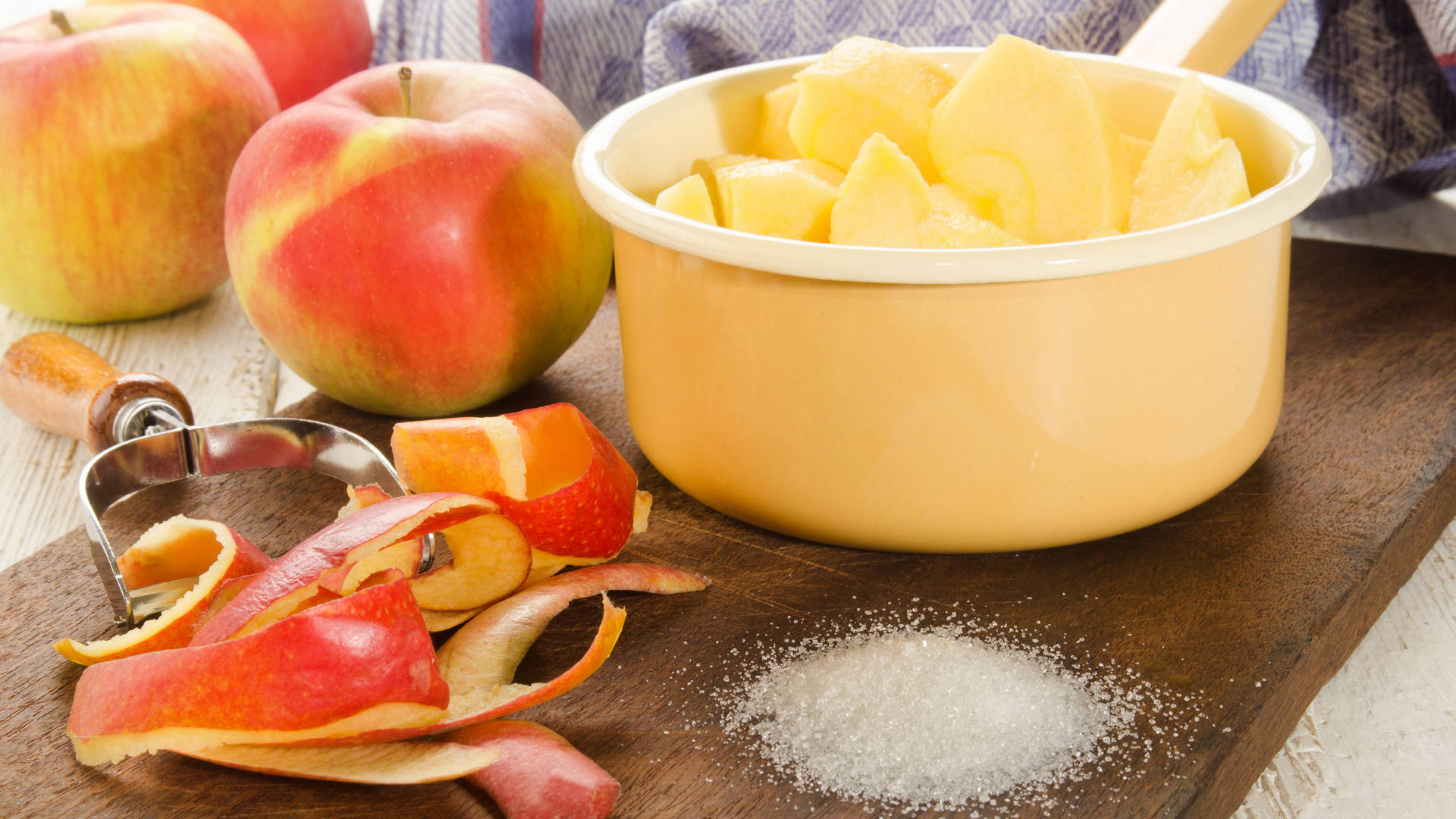 Для приготовления нужны яблоки сортов Гренни смит или обычная антоновка. На сковороду кладем 70 граммов сахара и на медленном огне придаем ему карамельный оттенок, после этого добавляем 30 граммов сливочного масла и полкило нарезанных яблок.