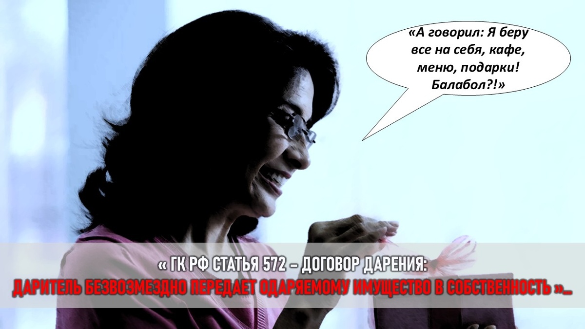 - Скрытые условия дарения: Жертва оплатила различные «подарки», которые, согласно законодательству, должны быть безвозмездными, что является явным признаком скрытой купли-продажи.
