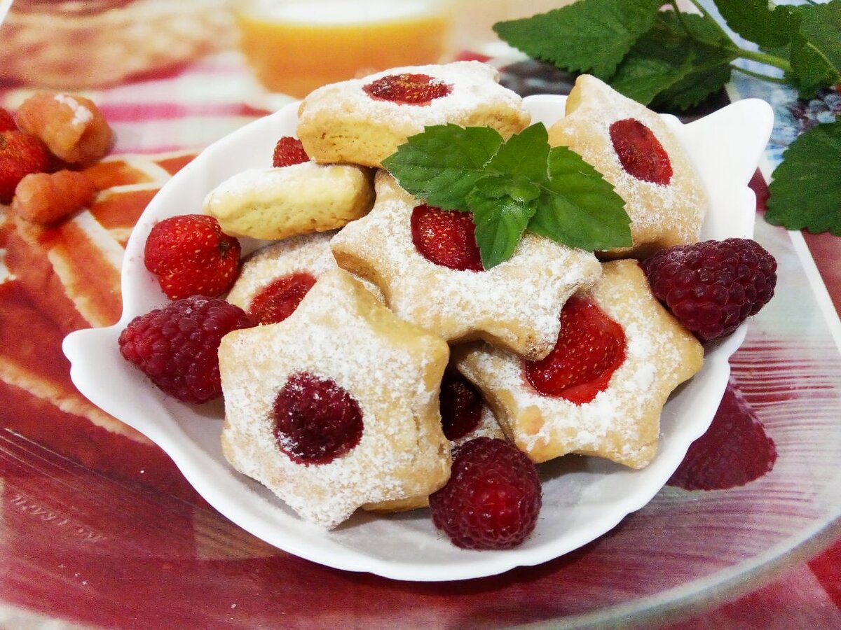 В каждой фигурке делают углубление для ягод, которые помещаются туда. Выпекать печенье необходимо при температуре 180°C, до золотистой корочки, примерно 15-20 минут.