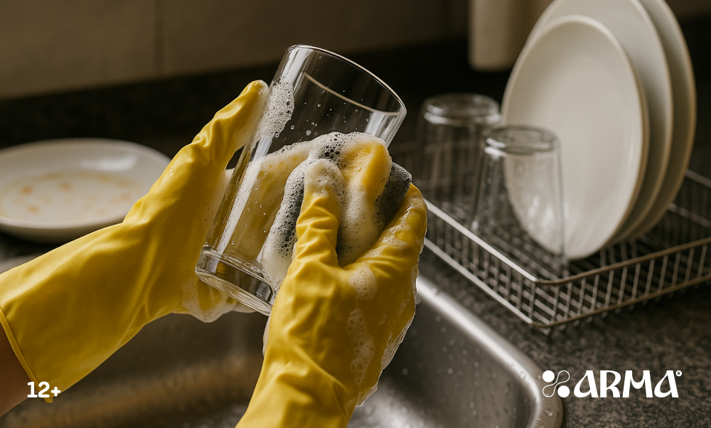 Когда дело доходит до самого процесса мытья, соблюдайте последовательность. Начинайте с наименее загрязненной посуды: бокалы и столовые приборы можно мыть в первую очередь, а самые грязные предметы, такие как кастрюли, оставьте напоследок. Важно работать с теплой водой, поскольку она расщепляет жир и одновременно не вредит коже.