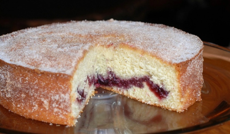 - После выпекания вынуть пирог из формы, дать немного остыть. Этот пирог можно использовать не только как самостоятельный десерт, но и как основу для торта. Лёгкая кислинка джема отлично дополнит вкус сметаны или глазури.