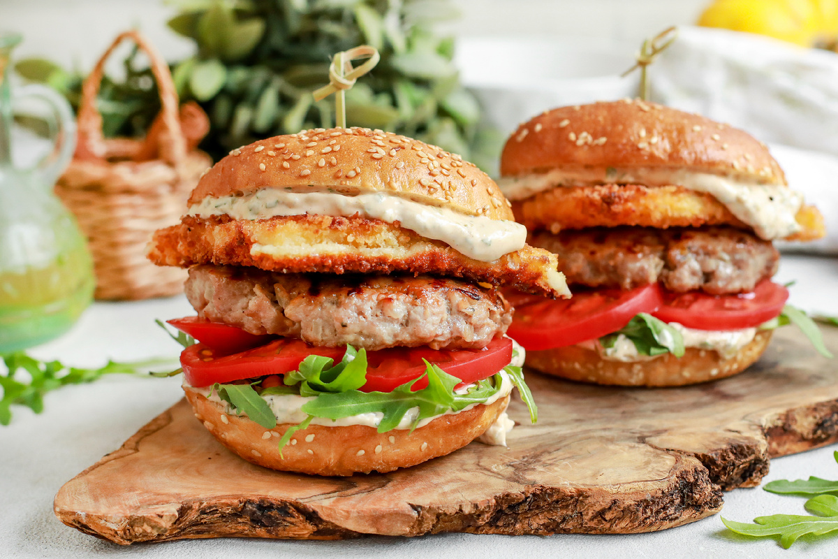 3. Приготовление соуса и финальные штрихи: Для соуса нарезать корнишоны и каперсы, мелко порубить петрушку. В миске перемешать майонез, кетчуп, каперсы, корнишоны и специи. Поджарить разрезанные булочки на сковороде, намазать соусом, добавить рукколу, помидоры, котлету и обжаренную моцареллу. Накрыть верхней булочкой и скрепить шпажкой.