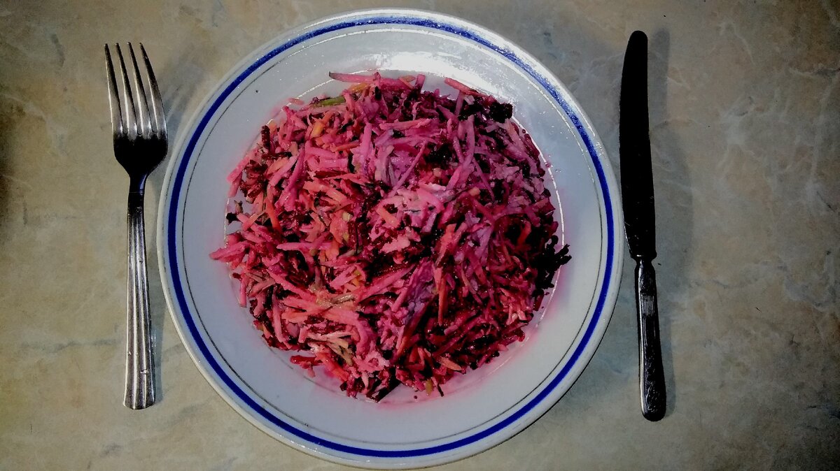 Все ингредиенты берутся в равных пропорциях и натираются на мелкой терке. Для улучшения вкуса можно добавить немного чеснока и соли. Заправка в виде нежирной сметаны или майонеза сделает салат более нежным, а для тех, кто следит за фигурой, идеально подойдет легкий вариант с растительным маслом и уксусом.