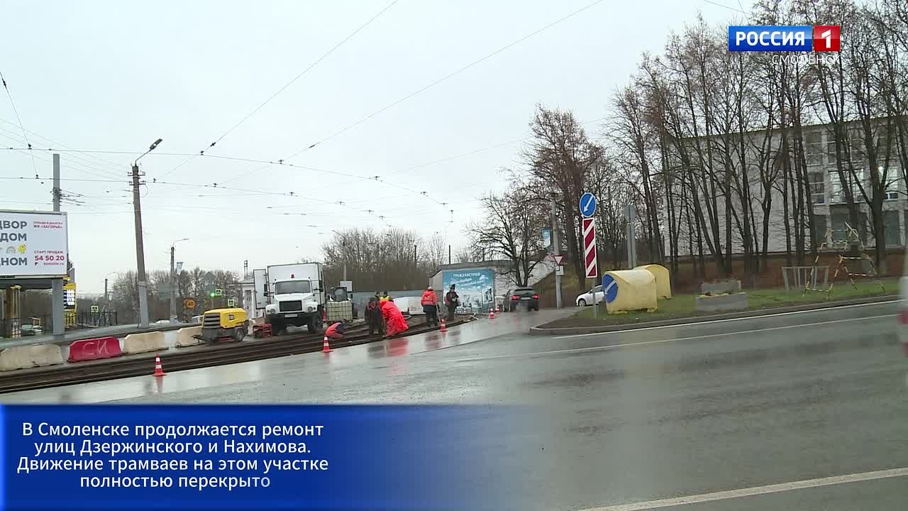 В Смоленске продолжается ремонт улиц Дзержинского и Нахимова. Движение трамваев на этом участке полностью перекрыто