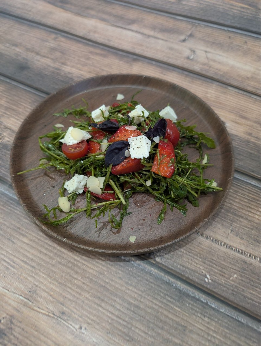 Начните с тщательной промывки клубники, черри и рукколы. Затем нарежьте клубнику и помидоры, выкладывая их на рукколу на тарелке. Не забудьте о сыре — его тоже можно нарезать кубиками. Для заправки смешайте масла, бальзамический соус и мед. Полейте получившимся соусом салат, добавьте специи и красиво оформите кедровыми орехами и базиликом.