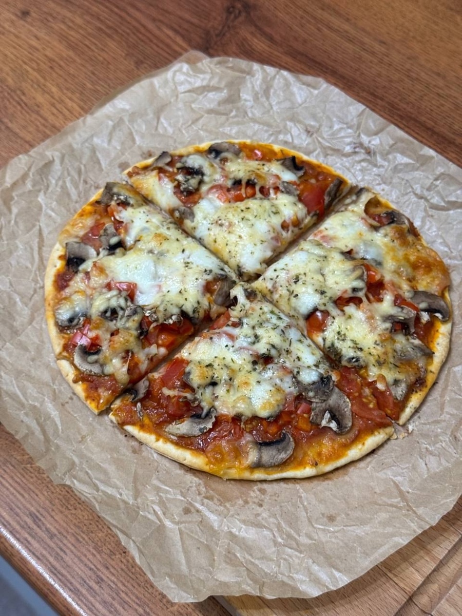 Через 15 минут ароматная, золотистая пицца готова. Это отличное блюдо подходит как для неожиданного гостя, так и для уютного вечера в кругу семьи. Приятного аппетита!