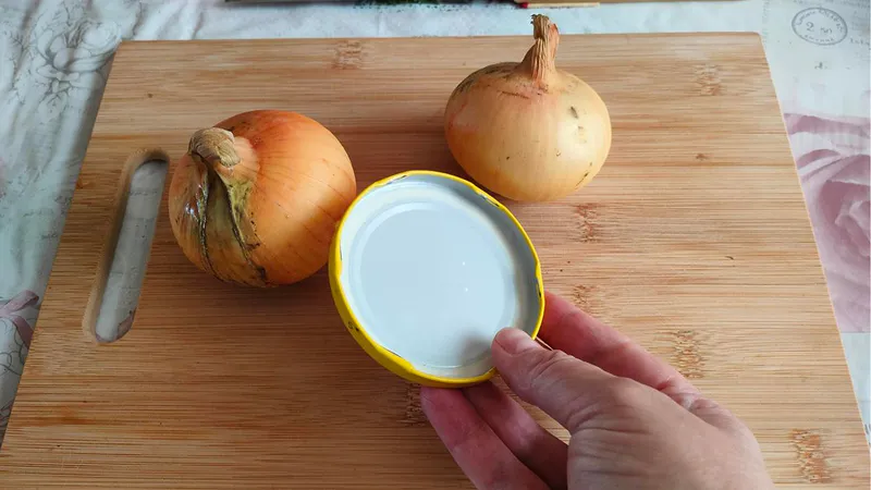 - Сначала очистите луковицу от шелухи и разместите на крышке от банки. Это поможет удержать лук в одном месте, предотвращая его скатывание;