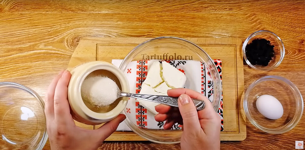 Начните с подготовки творога: в глубокой миске смешайте 180 г творога с одной столовой ложкой сахара и одной чайной ложкой ванильного сахара. Добавьте горсть изюма. Если изюм оказался жестким, рекомендуем предварительно замочить его в воде на несколько минут.