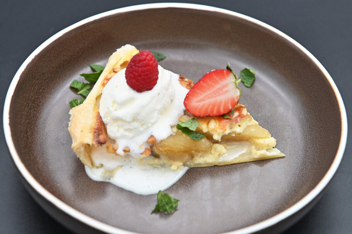 Яблоки следует очистить от кожицы и удалить семена, после чего нарезать плоды на дольки толщиной около 1 см.Разогрейте сковороду и растопите в ней сливочное масло с палочками корицы. После этого добавьте яблоки и часть сахара, тщательно перемешав. Затем влейте коньяк и оставьте на медленном огне.Раскатайте тесто в квадратный пласт, чуть больше формы для выпечки. Выложите тесто в подготовленную форму, удаляя лишние края, и проколите его вилкой для равномерного выпекания.В отдельной емкости взбейте яйца с сметаной и аккуратно вылейте часть смеси на тесто, равномерно распределяя.Выложите карамелизированные яблоки поверх яичной смеси и добавьте оставшуюся массу, стараясь не превышать края формы. Посыпьте кедровыми орехами и корицей.Поставьте пирог в предварительно разогретую до 180 градусов духовку и выпекайте от 10 до 15 минут.Когда пирог станет золотистым, выньте из духовки, нарежьте на порционные кусочки и подавайте с шариком любимого мороженого, свежими ягодами и веточкой мяты.Идеальный десерт готов! Такой пирог не только порадует вас, но и оставит незабываемые впечатления у ваших гостей. Приятного аппетита!
