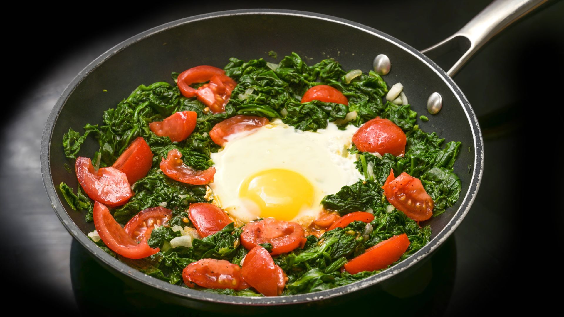 Следом влейте томатную пасту, нарезанные помидоры без кожуры. Влейте воду, вбейте яйца так, чтобы желток остался целым. Посолите, поперчите. Готовьте примерно пять-семь минут без крышки, советуют на портале «Армения. Гид по стране». Перед подачей присыпьте измельченными укропом, петрушкой и зеленым луком.