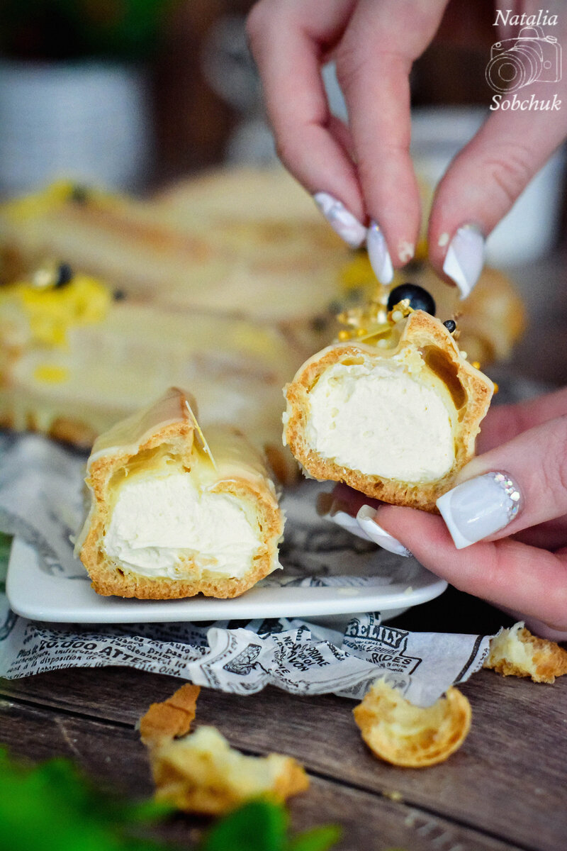 Как только эклеры подрумянятся, остудите их на решетке, сделав небольшой надрез для заполнения кремом. Для масляного крема взбить размягченное масло до пышности и добавить сгущенное молоко. С помощью кондитерского мешка наполнить эклеры кремом.