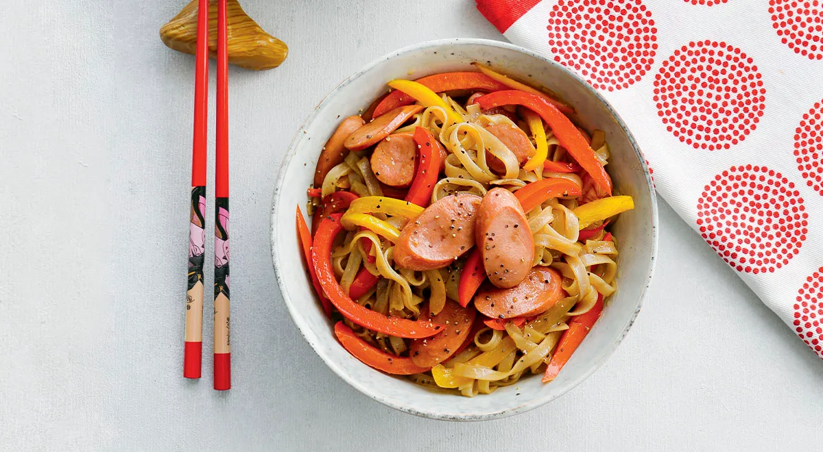 Рисовая лапша с сосисками и болгарским перцем: быстро и вкусно на каждый день