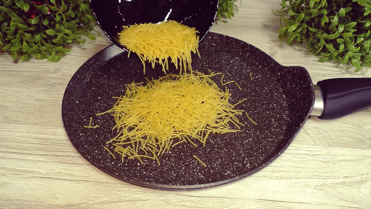 1. Для начала, на сухой сковороде обжарить вермишель до золотистого цвета. Это придаст блюду приятный ореховый аромат и хрустящую текстуру. Как только вермишель станет румяной, следует переложить её в миску, чтобы остановить процесс жарки и избежать подгорания.