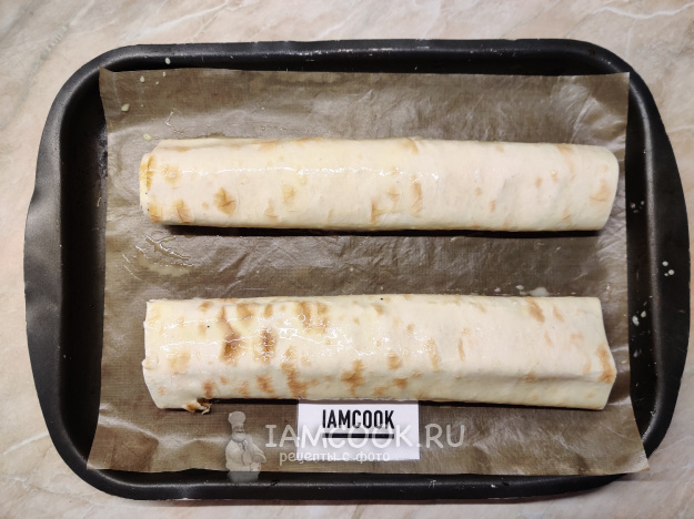 Теперь стоит перейти к лавашу: взять два листа, разделить начинку наполовину и распределить её на края каждого листа. Засучив рукава, свернуть лаваш в рулеты.