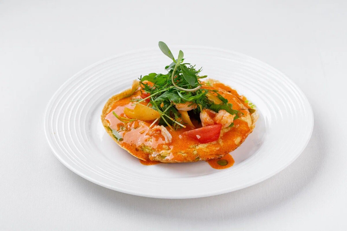 Как только омлет будет готов, аккуратно переложите его на тарелку. В соус биск добавьте сливки и нарезанные помидоры, затем полейте этой смесью омлет. Завершите подачу жареными креветками и свежим миксом салата.