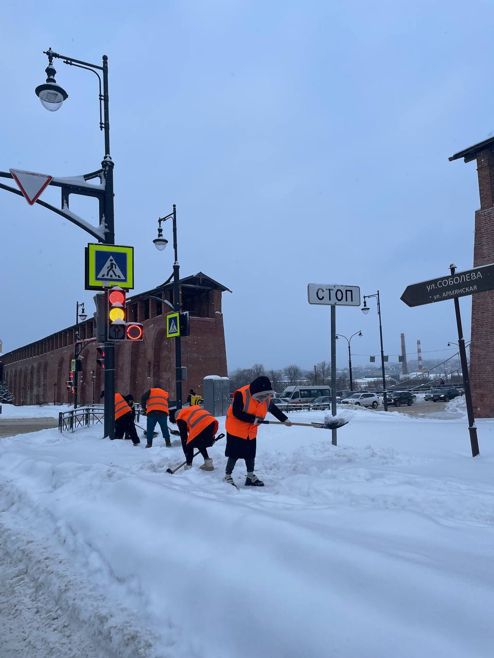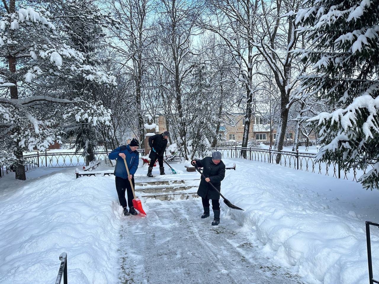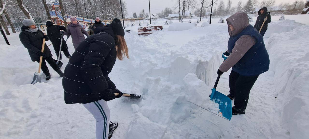Расчищать снег на тротуарах и общественных территориях помогают студенты, волонтёры.